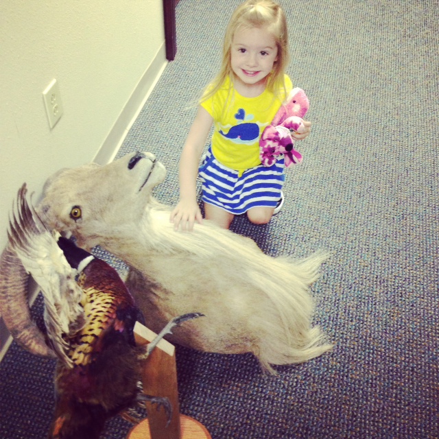 Here's a little funny story. We were cleaning James' office out and James had a few dead animals in there. Farrah wanted to pet them so badly but was scared of them. I asked her if she wanted to touch them and she asked "Will they bite me??" No, honey...they're dead!